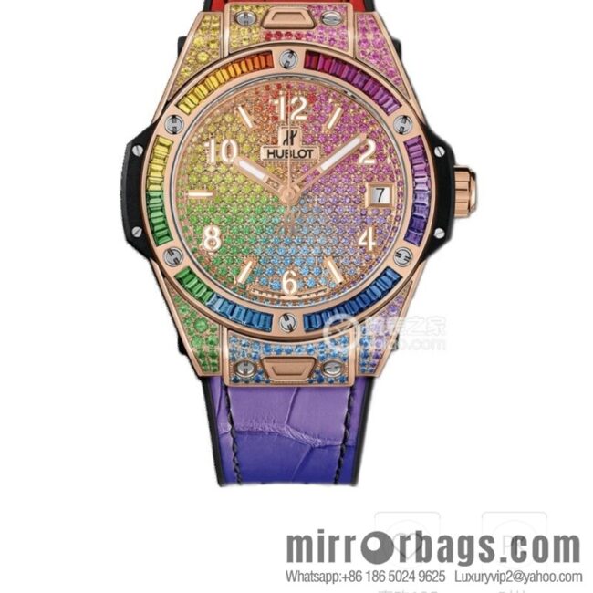 Hublot BIG BANG series, model 465.OX.9910.LR. 0999BIG BANG, HUB1710 automatic mechanical movement, watch diameter 39 mm case, dial color Color Dial shape Round strap color Black/multi-color clasp type folding clasp, set 118 colored gemstones: ruby, pink sapphire, amethyst, blue sapphire, blue topaz, tsavorite, yellow sapphire; bezel set with 48 square-cut colored gemstones: ruby, pink sapphire, amethyst, blue sapphire, blue topaz, tsavorite, yellow sapphire and orange sapphire Dial material set with 307 colored gemstones: ruby, pink sapphire, amethyst, blue sapphire, blue topaz, tsavorite, yellow sapphire! The mirror surface is made of scratch-proof sapphire glass, imported fluororubber strap and fluororubber sole belt, with the original folding buckle, which is comfortable and full of hand texture!!!