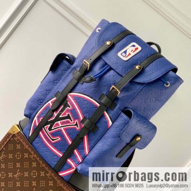 M21104 Blue Louis Vuitton and NBA launch the Christopher medium backpack, a signature color for the Monogram embossing Taurillon leather (fabric), embellished with the new LV basketball logo and classic NBA trim, with leather (fabric) trim and shoulder strap. Dimensions: 38.0 x 44.0 x 21.0 cm (L x H x W)