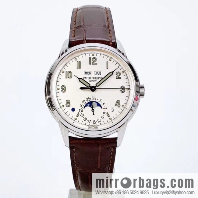 GR spends a lot of money to create a classic timepiece ; the Patek Philippe 5320G-001 Super Complex Timepiece has a double-layer stainless steel case with a diameter of 40mm and one-piece stamping. It pays tribute to the classic design language. The cream-colored dial creates a retro atmosphere. The edge of the dial is engraved with dense minute-to-second scales, with gold Arabic numerals and five-minute convex round scale studs, which is more three-dimensional. The hour hands are based on the Barton-style design, with a pointed and long needle tip. This characteristic shape echoes the hands of the Ref. 1463 chronograph in the 1950s. The 6 o’clock position of the dial is the moon phase display and the date distribution. There is a leap year indication on the right side of the date, and a day/night indicator on the left. All the perpetual calendar logos are good and can be read at a glance. Inside is an imitation 324 S Q self-winding movement, a hardcover version of the legendary 324 self-winding movement. The movement splint bridge is chamfered and the edges are carefully polished. The main splint is decorated with fish scales, while the splint is decorated with Geneva ripples. The surface of the splint is engraved with gold. The screw grooves are polished and chamfered, and even the drilling holes are also polished. With a chocolate brown cowhide strap, it further brings out the retro atmosphere. Full of classic atmosphere, watch friends are welcome to taste it