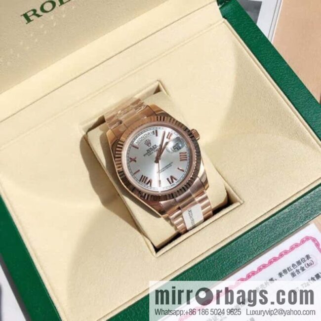 The happiness of the rich is so simple and unpretentious. The true rose gold watch is here. The whole body is wrapped in 18k gold, with a thickness of 5um. The GTC China authoritative certification certificate can be checked on the Internet! The watch diameter is 41mm, loaded with the original Swiss eta-2836 movement, and guaranteed for life! The log type II is a member of the Rolex Oyster family. It inherits the characteristics of the Oyster Perpetual Log type watch that came out in 1945. The log type II debuted in 2009 and is the first choice for those who advocate the classic and pursue innovation. This classic watch has its own unique charm and is even more noble. The log type watch is a classic of modern watches. It is also the world’s first waterproof and self-winding watch with a calendar display window on the dial. This was an unparalleled technological innovation at the time, and the log type got its name. The triangular pit ring has always been recognized as the iconic design of the log watch, and the Rolex log watch has become the most recognizable watch. When the Oyster watch was born in 1926, the triangular pit pattern had a specific purpose: to tighten the outer ring to a fixed position on the case to ensure the watch’s precise waterproof performance. The oyster case has a pivotal position in the history of Rolex. It is named because the case can be closed like an oyster case. With the two major inventions of the screw-in back cover and the screw-in waterproof winding crown, the watch can operate perfectly in water. The screw-in winding crown and the screw-in back cover of the case are at the heart of the Oyster watch. Created by Rolex in 1953, the double-clasp lock device ensures that the screw-in crown is completely waterproof, relying on two sealed zones set inside the tube and crown. All Oyster models are equipped with this device, which is waterproof to a depth of 100 meters. The Oyster strap is the embodiment of perfect shape, function, aesthetics and technology, and is exquisite and charming. Introduced in the late 1930s, this metal strap consists of three rows of wide, flat links and is extremely strong. It has always been the most widely used strap in the Oyster series. Influenced by the pioneering timepiece log type, the log type II has a calendar window at 3 o’clock. The date can be instantly changed in just a few milliseconds in the early morning. Rolex invented the convex enlarged calendar window in 1953, which magnifies the date by 2.5 times for easy reading.